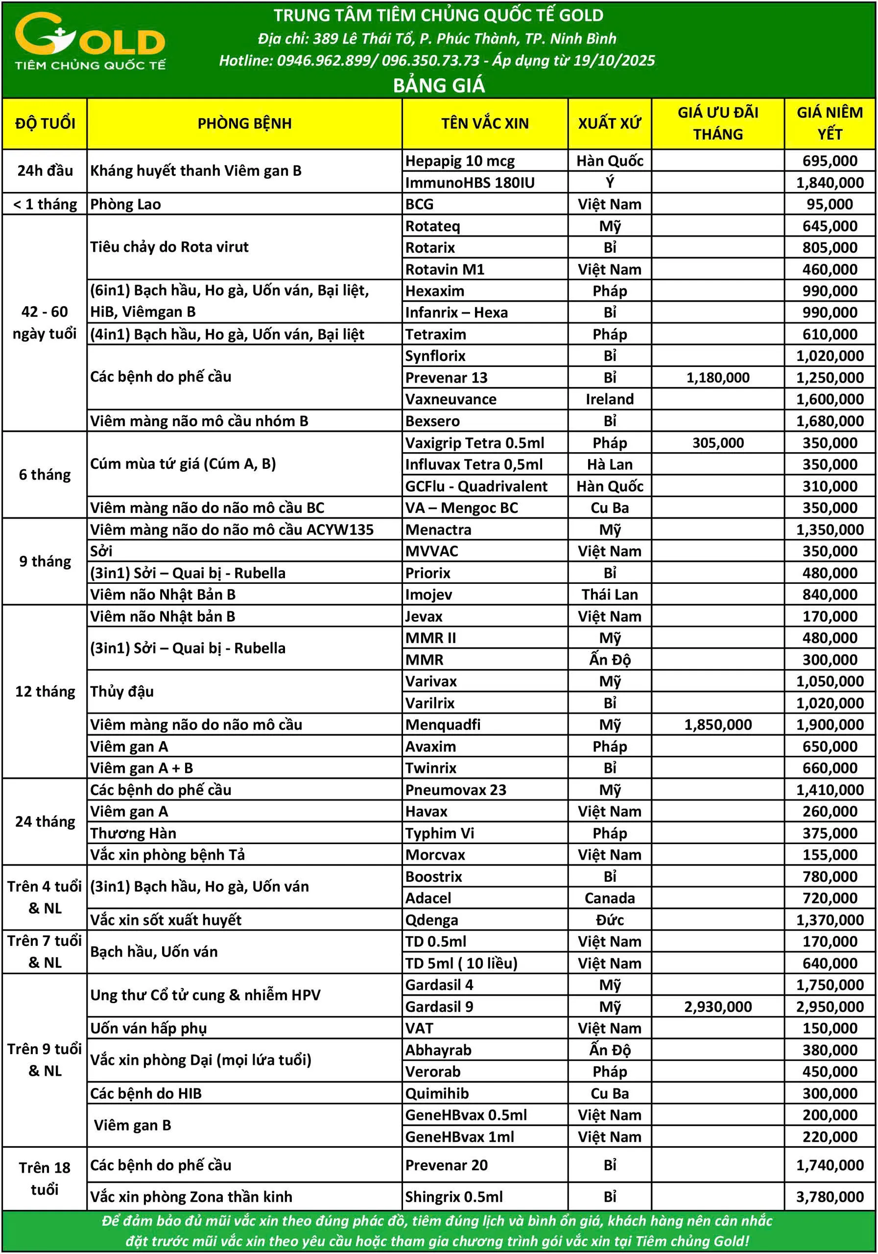 Bảng giá vắc xin trên được áp dụng từ ngày 01.08.2025 đến khi có thông báo mới, và MIỄN PHÍ khám, tư vấn với Bác sĩ chuyên khoa và các tiện ích đi kèm.